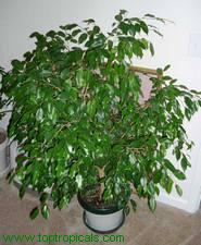 Фикус Бенджамина представляет собой большой раскидистый куст или маленькое деревце с густой листвой, с поникающими стеблями. Листья у фикуса Бенджамина достигают длины 10 см. Они ярко-зеленые, овальной формы с острыми кончиками, жесткие и восковые на вид. А вот цветков у фикуса Бенджамина не бывает.